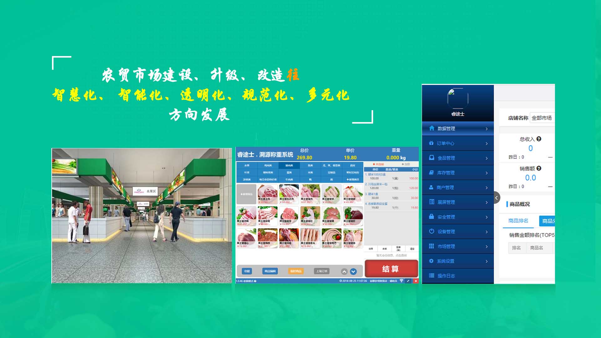 創(chuàng)新實現(xiàn)了【智慧農(nóng)貿(mào)溯源管理系統(tǒng)】與【智能稱重收銀】一體化解決方案,集市場管理、運(yùn)營管理、溯源追溯、智能收銀大數(shù)據(jù)運(yùn)用于一體,硬件、軟件與管理系統(tǒng)完美結(jié)合。適用于農(nóng)批、農(nóng)貿(mào)市場蔬菜、生鮮、水果、水產(chǎn)、肉類、熟食等稱重和非稱重銷售;由于采用一體化設(shè)計,解決了傳統(tǒng)農(nóng)貿(mào)市場無法實現(xiàn)的信息化、智能化、可追溯的管理問題;使稱重、收銀、追溯、管理、更透明、公正、安全,讓顧客無后顧之憂,給管理工作帶來極大的便捷與高效,對國內(nèi)農(nóng)產(chǎn)品行業(yè)的發(fā)展、農(nóng)產(chǎn)品流通管理起到了典范作用。 【睿途士首創(chuàng)】顛覆傳統(tǒng)的“智慧農(nóng)貿(mào)市場系統(tǒng)”,解決了傳統(tǒng)農(nóng)貿(mào)系統(tǒng)單一安卓掛屏,昂視不方便看、不直觀、無互動性,傳輸信息不齊全、不穩(wěn)定的問題,也解決了按鍵電子秤商品難找、商品代碼難記、按鍵操作不靈活、支付不智能,對收銀管理、銷售商品、菜名、菜價、打折、優(yōu)惠、會員、線上下單、采購等無法實現(xiàn)實際菜品交易和追溯等問題。 更具顛覆性的是睿途士智慧系統(tǒng)擁有三大管理平臺(市場管理平臺、總部運(yùn)營管理平臺、商戶后臺管理平臺)、一個可視操作前臺和三大追溯功能,讓遠(yuǎn)程管理、數(shù)據(jù)傳輸、人機(jī)互動、智能控制、移動支付、大數(shù)據(jù)、互聯(lián)通信、云端存儲、人工智能、智能城市、電子定位、智能收銀等功能得以實現(xiàn)。